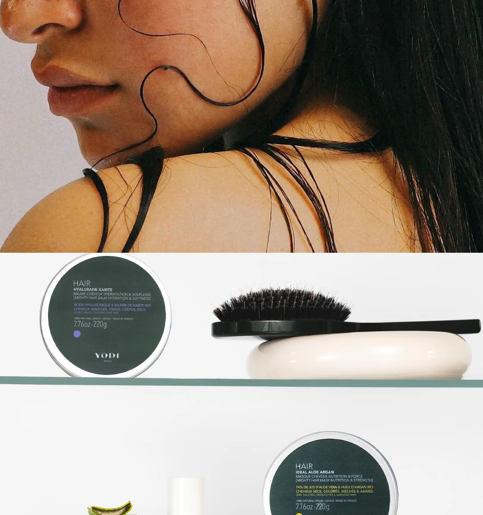 Une gamme de soins sans eau, concentrés en actifs naturels pour les cheveux et la peau, testés sous contrôle dermatologique. Naturels. Vegan. Made in France. Notés 100/100 sur Yuka.