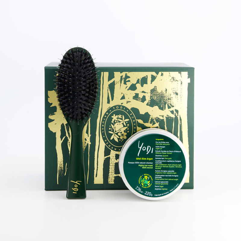 - Notre Brosse de soin : Cette brosse indispensable sait tout faire : activer la circulation du cuir chevelu, enlève les nœuds tout en douceur, gainer et lustrer le cheveu. Elle s’utilise tous les jours sans modération ! Fabriquée à la main en Italie grâce à un savoir-faire ancestral, la brosse est en acétate de coton et non en plastique ! Parfaitement étudiée, elle associe les bénéfices des poils de sanglier naturels à ceux du nylon. Les picots en nylon démêlent les nœuds tandis que les poils de sanglier distribuent les huiles naturelles du cheveu et lissent la cuticule : l’équilibre parfait pour maintenir des cheveux sains tout en évitant la casse.