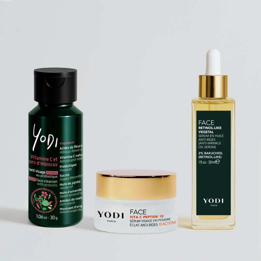 Le nettoyant prépare la peau en douceur en éliminant les impuretés tout en respectant le film hydrolipidique. Vita C Peptide 10 agit ensuite sur les marques du temps, l’unification du teint et la fermeté, grâce à sa formule innovante en poudre non rincée, concentrée en vitamine C, peptide anti-âge et prébiotique. Enfin, le sérum Rétinol-Like végétal nourrit intensément la peau, favorise le renouvellement cellulaire et aide à lisser rides et ridules, sans les effets irritants du rétinol classique.
