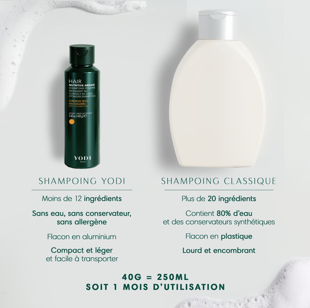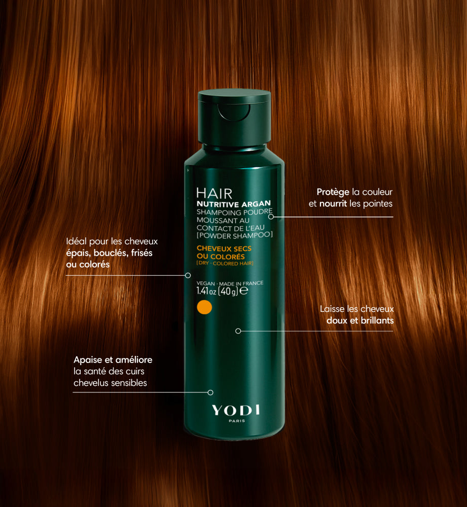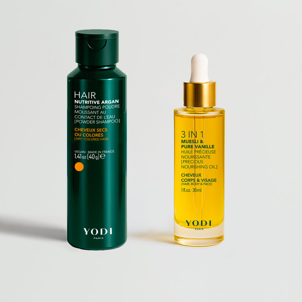 Ce coffret vous propose 1 shampoing en poudre Nutritive Argan (40 g) et 1 Huile Précieuse (30 ml).