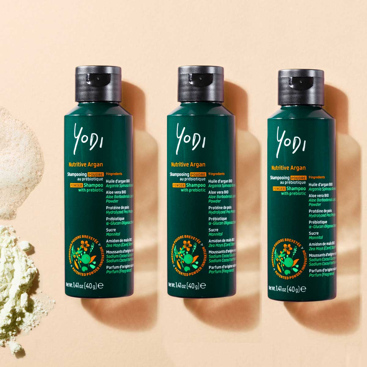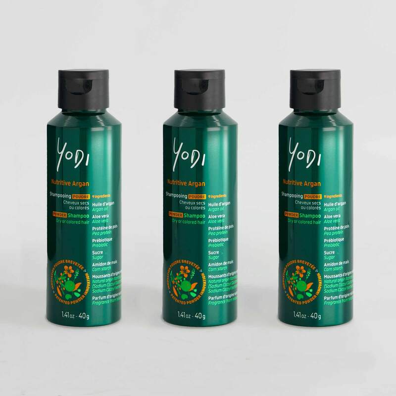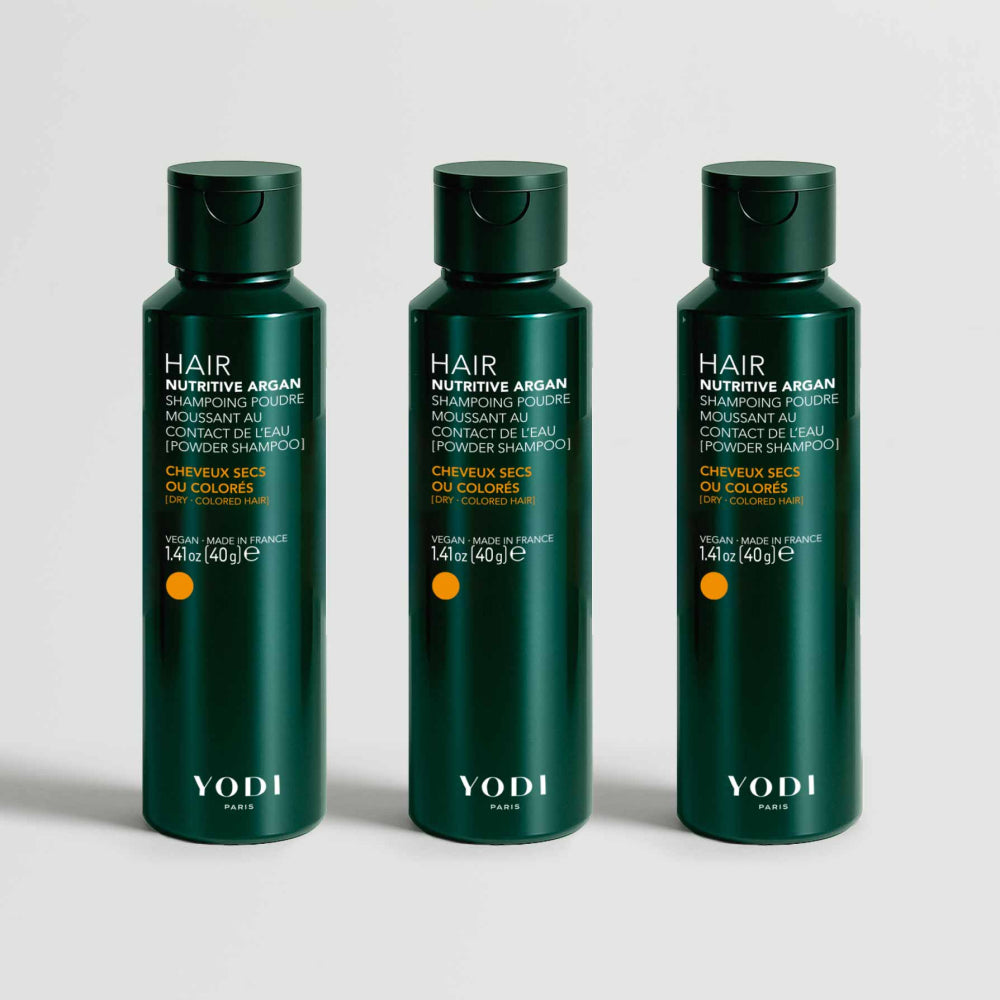 Kit de 3 shampoings en poudre moussants Nutritive Argan à prix doux. Parfaits pour les cheveux épais, secs ou abîmés. Prêts à l’emploi, à l’huile d’argan, de l'aloe vera BIO et aux protéines de pois. Enrichis en prébiotique, ces shampoings sont sans eau, sans conservateurs, ni sulfates. La poudre mousse instantanément au contact de l'eau comme votre shampoing classique, mais sans graisser le cuir chevelu ni abimer les cheveux.